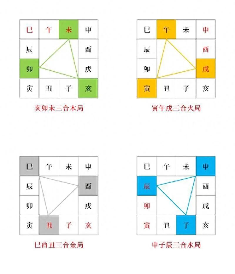 五行木火金水的十二长生中,长生、帝旺、墓库三地支的组合为地支三合。以五行木为例,亥为长生、卯为帝旺、未为墓库,亥卯未成三合木局。同理可知,寅午戌三合火局,巳酉丑三合金局,申子辰三合水局。