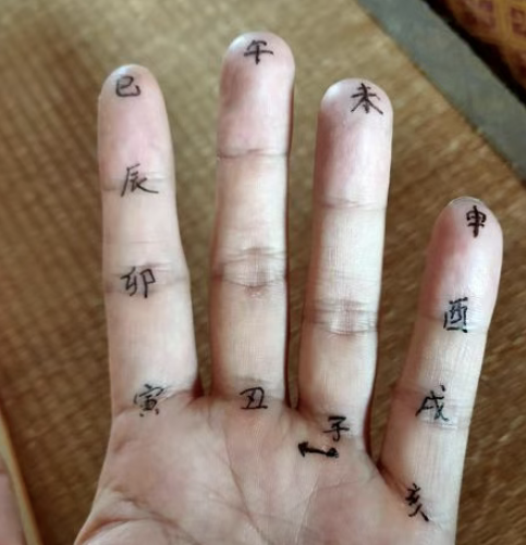 首先,我们把十二地支分布在左手掌上。这个简单,顺着手指和关节轮一圈就是,看下图: