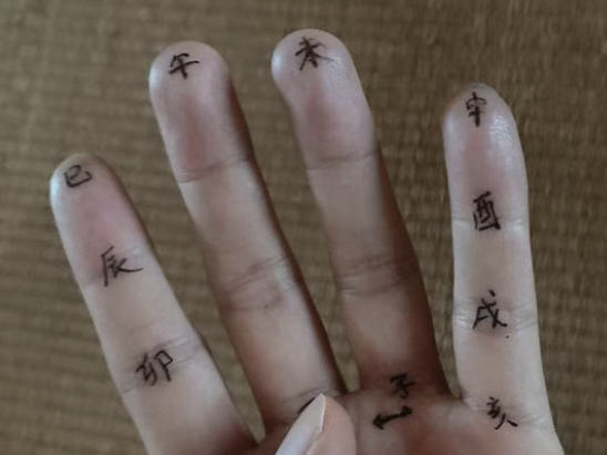 注意,子是在无名指下面,这个是固定不变的,不管哪一个风水流派,只要排出十二地支,都是这么在左手上排的。电视上演的“掐指一算”,基本都是在手上排天干地支,而且只用左手。谁要是用右手,你可以嘲笑他,当然,没有左手的人除外。